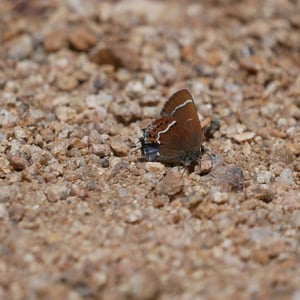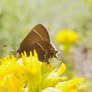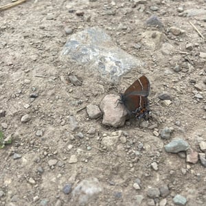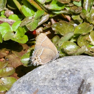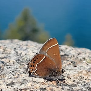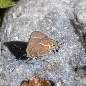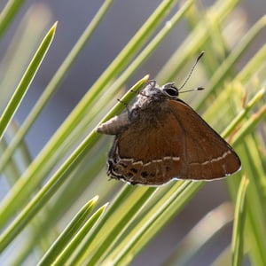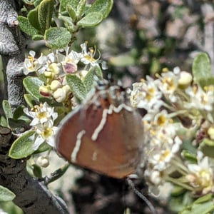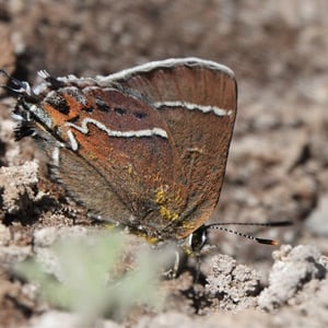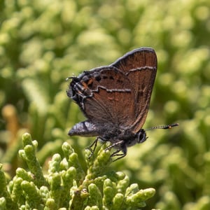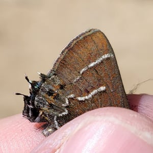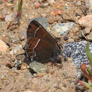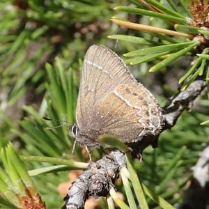 Callophrys spinetorum, the thicket hairstreak, is a butterfly of the family Lycaenidae. It was described by William Chapman Hewitson in 1867. It is found in North America from British Columbia through the Rocky Mountains to New Mexico and Mexico and through California to Baja California. The habitat consists of pinyon-juniper forests, mixed woodlands, and coniferous forests. The wingspan is 25–32 mm. The upperside is steel blue and the underside reddish brown. The hindwings with a white postmedian band which forms a W shape near the tail. Adults are on wing from May to August in one generation per year. They feed on flower nectar. The larvae feed on Arceuthobium species.