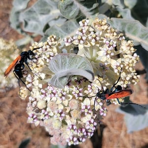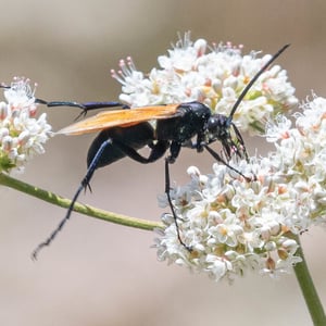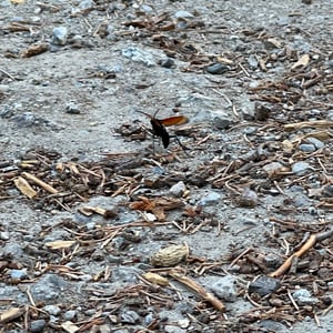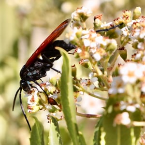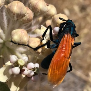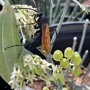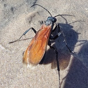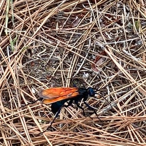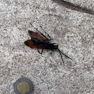 Pepsis thisbe, commonly known as the Tarantula Hawk, is a large and impressive insect found in the southwestern United States and Mexico. The females of this species are known for their unique hunting behavior, as they seek out and paralyze tarantulas to use as hosts for their eggs. With a wingspan of up to 4 inches, Pepsis thisbe is known for its striking black and orange coloration, making it easily recognizable in its habitat. Despite its intimidating appearance, the Tarantula Hawk is not aggressive towards humans unless provoked.