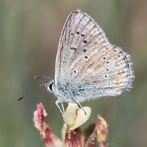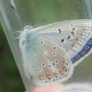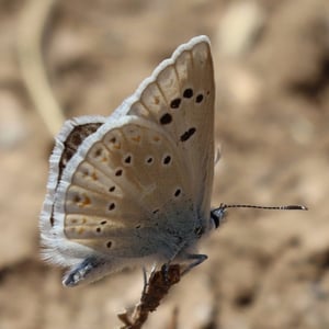 L. hylas Esp. (= dorylas Hbn., argester Bgstr., thetis Esp. (female)) (80 i). Of the size of myrrhina [ Polyommatus myrrhina (Staudinger, 1901)]; male above of a very glossy and peculiar blue; the female often smaller than the male, black-brown, with or without reddish marginal spots. The underside is unmistakable, the ocelli being reduced to a very few so, that the white forewing is usually without markings from the base to the reddish yellow submarginal spots. Central and South Europe as far as Asia Minor, according to Sloper also obtained in England (at Dover). ab. obsoleta Gillm. (= glycera Schultz) are European specimens in which the sparse ocelli of the hindwing beneath are on the road of becoming obsolete. – There exists also a geographical race with obsolescent ocelli, which is distinguished by the fringes being longer and white above; this is armena Stgr. [ now P. d. armena (Staudinger, 1871) ] (81 a), from Asia Minor, of which identical specimens are said by Hormuzaki to occur also in the Bukovina. – Very conspicuous is ab. metallica Favre; this is the name for females whose upperside bears near the base of both wings or only on the forewing intensely bright metallic blue spots, whose glitter can be distinctly perceived even in the flying specimen and which gives the insect a very strange appearance, ab. nigropunctata Wheel, has black submarginal dots on the hindwing above. – nivescens Kef. (= albicans Dup. & Gerh.) [ now Polyommatus nivescens Keferstein, 1851 ](80 i) is a form flying in Spain on limestone. The upperside of the male is dull grey-violet with a white silky gloss, similar to dolus, menalcas and coridon albicans. – Larva very similar to that of icarus, dark green, with black head, blackish dorsal line and yellow side-stripe; at each side of the dorsal line yellowish smears. In May and again in August on Thymus, Trifolium, Melilotus, Medicago, etc. The butterflies are partial to limestone soil and sand, and their occurrence is therefore rather sporadic, but they are plentiful in many districts. They fly in May and again in July, and like to drink on damp places on roads. Subspecies are: - Polyommatus dorylas magna Bálint, 1985 (Eastern Carpathians, Romania) - Polyommatus dorylas castilla (Fruhstorfer, 1910) (Spain) - Polyommatus dorylas armenus (Staudinger, 1871) (Caucasus, Armenia)