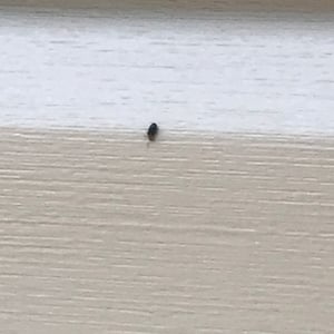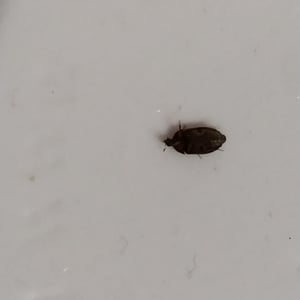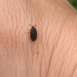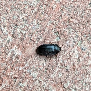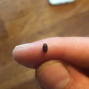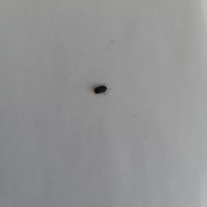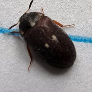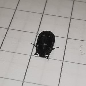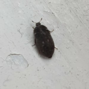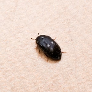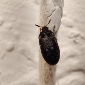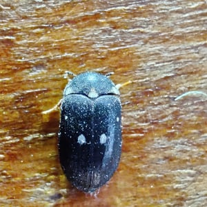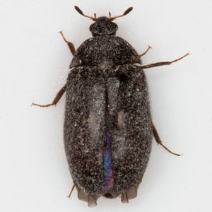 Attagenus pelio is a 4–6 mm-long oval shaped insect with two patches of white hair on the elytra.