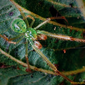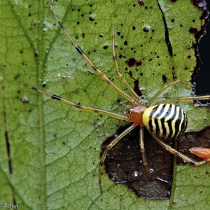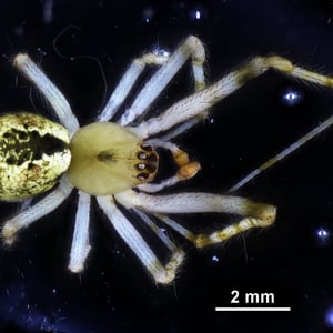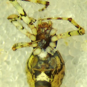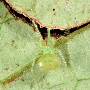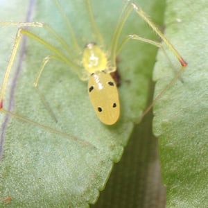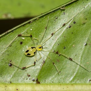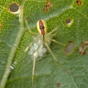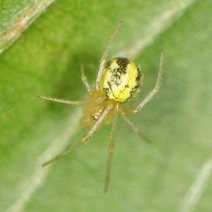 Theridion is a genus of tangle-web spiders with almost 600 described species around the world. Notable species are the Hawaiian happy face spider (T. grallator), named for the iconic symbol on its abdomen, and T. nigroannulatum, one of few spider species that lives in social groups, attacking prey en masse to overwhelm them as a team. Spiders in this genus are about as long or longer then they are wide. Their chelicerae have two or less teeth on the front edge and none on the back edge. The front leg is the longest in both genders, but the next longest is the second leg in males and the fourth leg in females. The epigyne can vary, but the pedipalp has a median apophysis and a colulus is absent from both genders. Philodromus cespitum, a species of running crab spider, preys on Theridion spiders in European fruit orchards.