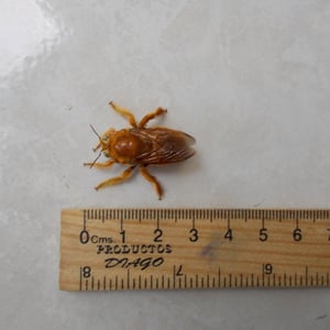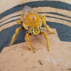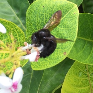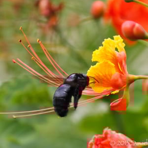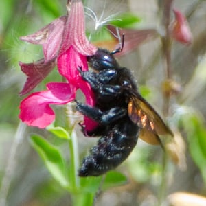 Xylocopa sonorina, commonly known as the Sonoran carpenter bee, is a large solitary bee species found in the southwestern United States and Mexico. It is known for its impressive size, with females reaching up to 1 inch in length. These bees are important pollinators, particularly for desert plants, and are known for their distinctive loud buzzing sound as they fly.