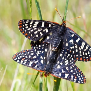 To start courtship, the male arrives in the vicinity of a fertilizable female, who quickly moves to the ground or to vegetation. The male follows and attempts to copulate with the female by curling his abdomen forward along the side of his body and inserting it between the female's hindwings. At this point, the female may stay still or flutter her wings and move away. If the female moves away, the male follows her and repeats his attempts to copulate. Only when the female stops and remains motionless can the male successfully copulate with her. In unsuccessful courtships, the female either flies away or rapidly flutters her wings until the male departs. Courtship in the variable checkerspot lacks an obvious male display such as the release of chemical signals by the male. Successful courtship in E. chalcedona lasts about a minute.
