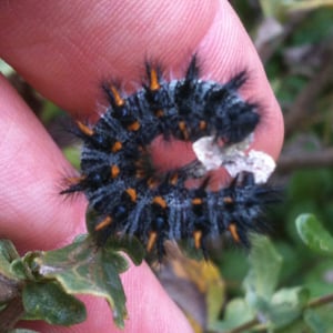 The principal food source for variable checkerspot larvae are the leaves of the flowering subshrub Diplacus aurantiacus that also usually serve as its host plant. D. aurantiacus contains large amounts of a leaf phenolic resin, which helps resist water loss during drought. Laboratory and field studies have shown that increased resin content is negatively correlated to the growth and survivorship of variable checkerspot larvae, indicating that the phenolic resin in D. aurantiacus plays in important role in deterring larvae from feeding on leaves. Another factor in D. aurantiacus plants that impacts larval growth is leaf nitrogen content. Unlike resin levels, heightened nitrogen levels are correlated with increased larval growth and survivorship. In a controlled experiment, larva that were fed a diet of fertilized D. aurantiacus plants, which contained 50% more nitrogen than unfertilized plants, experienced higher survival rates and growth than larvae that fed on unfertilized plants. While leaves with increased nitrogen content are the most attractive for the larvae, they are also the most valuable carbon-gainers for the plant. This leads to the activity patterns of larvae and D. aurantiacus plants synchronizing. Larvae emerge from diapause as D. aurantiacus plants start flowering. This is when the plants need the most carbon. The plants then concentrate their resin in their youngest leaves, which contain the largest amount of nitrogen; this resin deterrent forces larvae to feed on less valuable older leaves whose nitrogen content is lower. To maximize their own nutritional benefits, larvae selectively eat leaves with the highest available nitrogen:resin ratio. In addition, larvae exhibit a strong preference for feeding on host plant leaves that have been in the sun compared to leaves that have been in the shade. Another less common host plant for variable checkerspot larvae is Scrophularia californica, which lacks the resin defense system found in D. aurantiacus and is thus easier for larvae to digest. Larvae that feed on S. californica grow faster and larger than those that feed on D. aurantiacus. While D. aurantiacus may not be the most nutritious food for the larvae, it is the most reliable and widespread host available to the variable checkerspot and is often the plant closest to nectar sources, leading to its role as principal host plant and food source for the larvae.