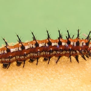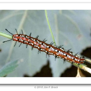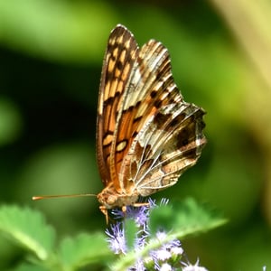 Euptoieta claudia, the variegated fritillary, is a North and South American butterfly in the family Nymphalidae. Even though the variegated fritillary has some very different characteristics from the Speyeria fritillaries, it is still closely related to them. Some of the differences are: variegated fritillaries have two or three broods per year vs. one per year in Speyeria; they are nomadic vs. sedentary; and they use a wide range of host plants vs. just violets. And because of their use of passionflowers as a host plant, variegated fritillaries also have taxonomic links to the heliconians. Their flight is low and swift, but even when resting or nectaring, this species is extremely difficult to approach, and, because of this, its genus name was taken from the Greek word euptoietos meaning "easily scared".