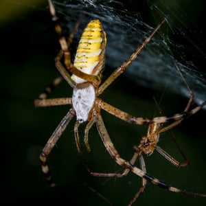 Argiope bruennichi (wasp spider) is a species of orb-web spider distributed throughout central Europe, northern Europe, north Africa, parts of Asia, and the Azores archipelago. Like many other members of the genus Argiope (including St Andrew's Cross spiders), it shows striking yellow and black markings on its abdomen.