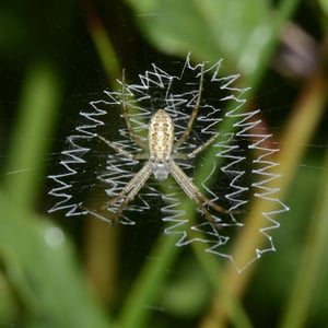 The spider builds a spiral orb web at dawn or dusk, commonly in long grass a little above ground level, taking approximately an hour. The prominent zigzag shape called the stabilimentum, or web decoration, featured at the centre of the orb is of uncertain function, though it may be to attract insects. When a prey item is first caught in the web, Argiope bruennichi will quickly immobilise its prey by wrapping it in silk. The prey is then bitten and then injected with a paralysing venom and a protein-dissolving enzyme.