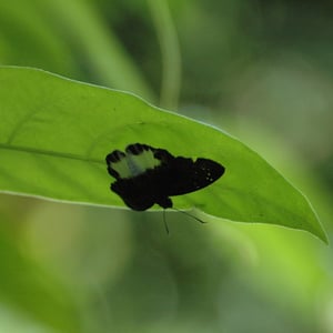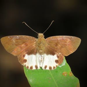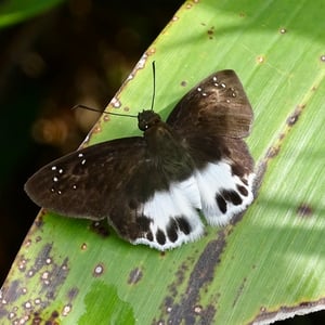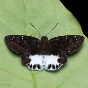 "Male. Upper.side. Forewing black, usually more densely black than in Tagiades menaka, markings similar except for two extra spots, one below the cell spot at the origin of vein 5, and the other in the middle of first median interspace, bringing the four spots (including the sub-costal spot) into a slightly curved Hue. Hindwing with the white space generally smaller than in T. menaka, the marginal spots similar, the two black spots within the white space absent. Underside. Forewing paler, markings as above, Hindwing like the underside of menaka, the black spots larger; palpi, legs, head and body above and below similar. Female similar to the male, the semi-hyaline spots on the forewing and the black spots on the hindwing larger, the two large black spots on the inner side of the black apical band half inside the white space as in the female of T. menaka." - Charles Swinhoe The larvae feed on Dioscorea oppositifolia, Dioscorea alata and Smilax species.