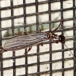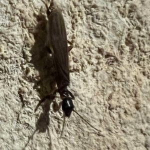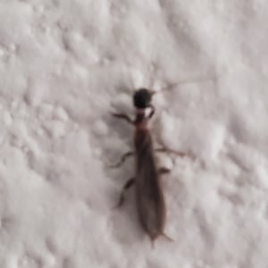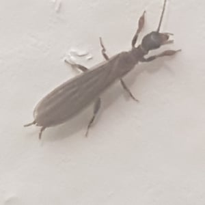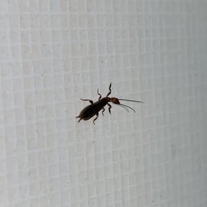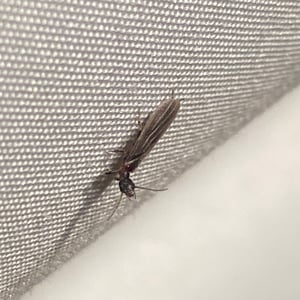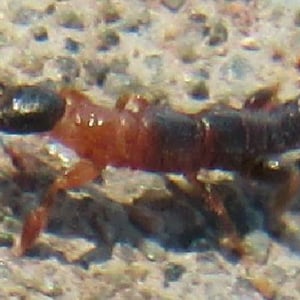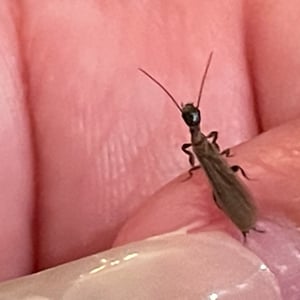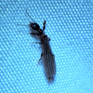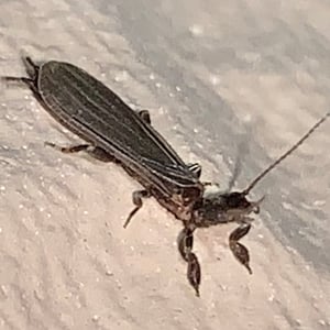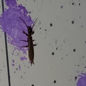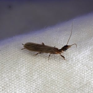 All webspinners have a remarkably similar body form, although they do vary in coloration and size. The majority are brown or black, ranging to pink or reddish shades in some species, and range in length from 15 to 20 mm. The body form of these insects is completely specialised for the silk tunnels and chambers in which they reside, being cylindrical, long, narrow and highly flexible. The head has projecting mouthparts with chewing mandibles. The compound eyes are kidney-shaped, there are no ocelli, and the thread-like antennae are long, with up to 32 segments. The antennae are flexible, so they do not become entangled in the silk, and the wings have a crosswise crease, allowing them to fold forwards and enable the male to dart backwards without the wings snagging the fabric. The first segment of the thorax is small and narrow, while the second and third are larger and broader, especially in the males, where they include the flight muscles. All the females and nymphs are wingless, whereas adult males can be either winged or wingless depending on species. The wings, where present, occur as two pairs that are similar in size and shape: long and narrow, with relatively simple venation. These wings operate using basic hydraulics; pre-flight, chambers (sinus veins) within the wings inflate with hemolymph (blood), making them rigid enough for use. On landing, these chambers deflate and the wings become flexible, folding back against the body. Wings can also fold forwards over the body, and this, along with the flexibility allows easy movement through the narrow silk galleries, either forwards or backwards, without resulting in damage. In both males and females the legs are short and sturdy, with an enlarged basal tarsomere on the front pair, containing the silk-producing glands; the mid and hind legs also have three tarsal segments with the hind femur enlarged to house the strong tibial depressor muscles that enable rapid reverse movement. It is these silk glands on the front tarsi that distinguish the embiopterans; other noteworthy characteristics of this group include three-jointed tarsi, simple wing venation with few cross veins, prognathous (head with forward-facing mouthparts), and absence of ocelli (simple eyes). The abdomen has ten segments, with a pair of cerci on the final segment. These cerci, made up of two segments and asymmetric in length especially in the males are highly sensitive to touch, and allow the animal to navigate while moving backwards through the gallery tunnels, which are too narrow to allow the insect to turn round. Because morphology is so similar between taxa, species identification is extremely difficult. For this reason, the main form of taxonomic identification used in the past has been close observation of distinctive copulatory structures of males, (although this method is now thought by some entomologists and taxonomists as giving insufficient classification detail). Although males never eat during their adult stage, they do have mouthparts similar to those of the females. These mouthparts are used to hold onto the female during copulation.