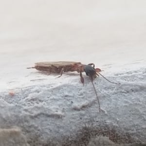 The Sclerogibbidae are a small family of aculeate wasps that are specialist parasites of embiopterans. The wasp lays an egg on the abdomen of a nymph. The wasp larva emerges and attaches itself to the host's body, consuming the host's tissues as it grows. It eventually forms a cocoon and drops off the carcass. A Neotropical tachinid fly, Perumyia embiaphaga, and a braconid wasp species in the genus Sericobracon, are known to be parasitoids of adult embioptera. A few scelionid wasps in the tribe Embidobiini are egg parasitoids of the Embioptera. A protozoan parasite in Italy effectively sterilises males, forcing the remaining female population to become parthenogenetic. These parasites and agents of disease may put evolutionary pressure on embiopterans to live more socially. Adult webspinners are vulnerable when they emerge from their galleries, and are preyed on by birds, geckos, ants and spiders. They have been observed being attacked by owlfly larvae. Birds may pull sheets of silk off the galleries to expose their prey, ants may cut holes to gain entry and harvestmen may pierce the silk to feed on the webspinners inside.