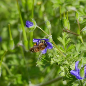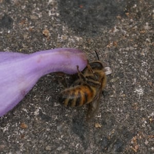 As an invasive species, feral western honey bees are a significant environmental problem in non-native areas. Imported bees may displace native bees and birds, and may also promote reproduction of invasive plants ignored by native pollinators. Honey bees are not native to the Americas, arriving with colonists in North America in the 18th century. Thomas Jefferson mentioned this in his Notes on the State of Virginia: The honey-bee is not a native of our continent. Marcgrave indeed mentions a species of honey-bee in Brasil. But this has no sting, and is therefore different from the one we have, which resembles perfectly that of Europe. The Indians concur with us in the tradition that it was brought from Europe; but, when, and by whom, we know not. The bees have generally extended themselves into the country, a little in advance of the white settlers. The Indians therefore call them the white man's fly, and consider their approach as indicating the approach of the settlements of the whites. Honey bees have become an invasive species in the US, outcompeting native pollinators when resources are tight. With an increased number of honey bees in a specific area due to beekeeping, domesticated bees and native wild bees often have to compete for the limited habitat and food sources available. Western honey bees may become defensive in response to the seasonal arrival of competition from other colonies, particularly Africanized bees which may be on the offence and defence year round due to their tropical origin. In the United Kingdom, honey bees are known to compete with native bumblebees such as Bombus hortorum, because they forage at the same sites. To resolve the issue and maximize both their total consumption during foraging, bumblebees forage early in the morning, while honey bees forage during the afternoon. Most flowering plants depend on specialized pollinators to efficiently fertilize them. Cucurbits, for example, are pollinated by squash bees that specifically visit the early-blooming male flowers before sunrise, when honey bees are inactive, and then return to pollinate the female flowers later in the day. Such symbiotic relationships also mean that the specialized pollinator will be covered mainly in its host's specific pollen. The very generalized nature of the honey bee's nectar-gathering activities, potentially visiting dozens of different species in a single day, means that a flower visited by a honey bee will often get very little pollen from its own species. This diminished pollination can reduce the plant's ability to produce seeds, especially when the honey bees are squeezing out the native pollinators for a species, a problem occurring all over the United States because of honey bees and other invasive species. Unlike native bees, they do not properly extract or transfer pollen from plants with pore anthers (anthers which only release pollen through tiny apical pores); this requires buzz pollination, a behavior rarely exhibited by honey bees. Honey bees reduce fruiting in Melastoma affine, a plant with pore anthers, by robbing its stigmas of previously deposited pollen.