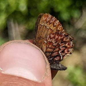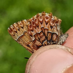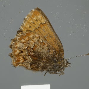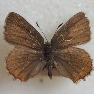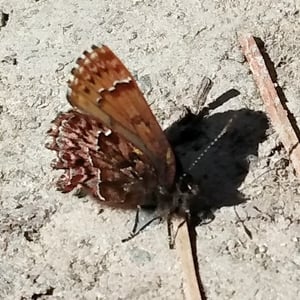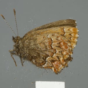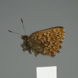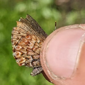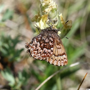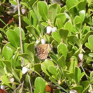 The western pine elfin (Callophrys eryphon) is a North American butterfly that ranges from British Columbia east to Maine and south to southern California, Arizona, and New Mexico. Males are brown and females are orange-brown, with both having bold patterned hind wings. The top of the wings have dark bars with a lighter chevron shaped margin. The body is 19–32 mm in length and has no tail. This butterfly is found in natural pine woods and evergreen forests in the territory (area of land) they inhabit. In the northwest United States they are found nesting in lodgepole pines and can be seen perched on shrubs and smaller trees while searching for food or looking for a mate. The western pine elfin is seldom seen outside its natural habitat. They feed on flower nectar including wild blueberries, milkweed, and clover.
