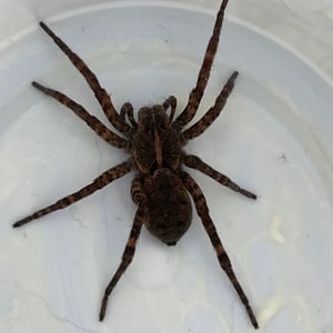 Tigrosa helluo is a species of spider belonging to the family Lycosidae, also known as wolf spiders. T. helluo was formerly known as Hogna helluo before differences between dorsal color patterns, habitat preferences, body structures, etc. were discovered. The species is native to the United States, Canada, and Mexico. It can be found across the eastern half of the United States, primarily in the Northeast and New England, and as far west as Nebraska and Kansas. T. helluo can be found in diverse habitats including woods, marshes, fields, and riparian areas. Typically, members of this species prefer to live in wetter areas as opposed to dry environments. Males tend to live for around a year and females will live for close to two years. The defining characteristic of T. helluo is its brown carapace and distinct yellow stripe starting from its anterior eyes extending down the cephalothorax. The underside of the abdomen has distinct black spots that distinguish T. helluo from other wolf spiders. At an average size of around 17 mm, T. helluo is one of the smaller wolf spiders. In addition, females tend to be larger than males in a display of sexual dimorphism. Like other spiders of the family Lycosidae, wolf spiders are solitary and live and hunt alone. Unless in the process of mating, T. helluo will remain alone. It is usually active at night, during which it hunts for prey. In addition, T. helluo does not create webs, although females will make burrows under rocks or boards. Relying on their excellent eyesight and senses, T. helluo members are great hunters. Members of T. helluo are not very aggressive and will not attack humans unless provoked. Their bites inject venom; however, it is not medically significant to humans, as only minor pain and swelling occur. Antivenom is rarely needed.