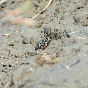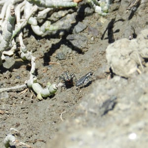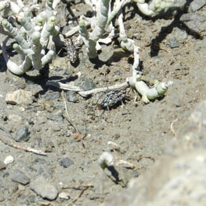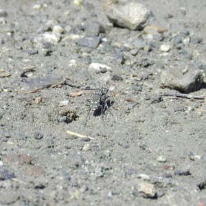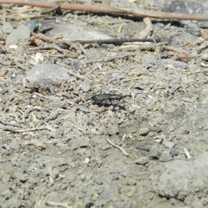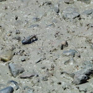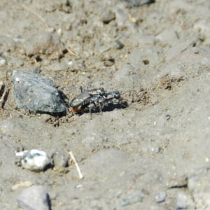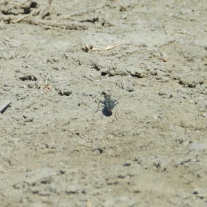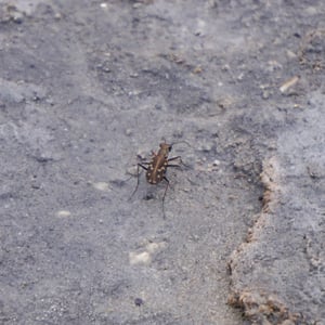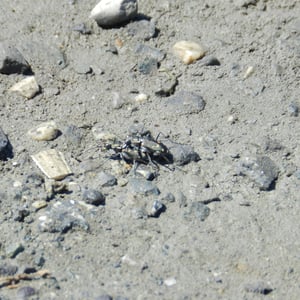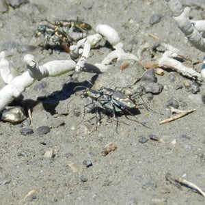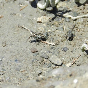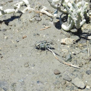 Cicindela haemorrhagica, commonly known as the bleeding tiger beetle, is a species of predatory insect found in various regions of North America. It is characterized by its vibrant metallic green or blue coloration and distinctive red markings on its elytra. This species is known for its exceptional speed and agility, using its long legs to chase down and capture its prey. The bleeding tiger beetle is typically found in sandy habitats, such as beaches or dunes, where it hunts small insects and other arthropods.