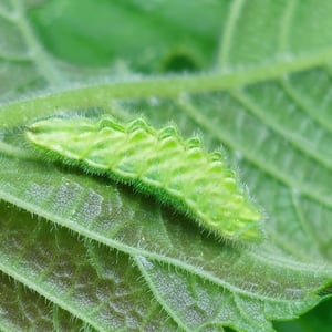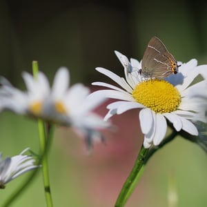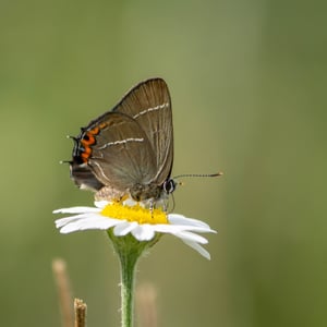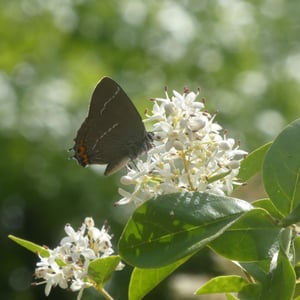 Eggs are laid singly, usually on the girdle scars near the terminal buds of elm trees. Unlike other hairstreak eggs, white-letter hairstreak eggs are harder to find during the winter months as they are flatter, turn brown with age, and are thus far less distinct on the twigs. Wych elm is reputedly preferred, but field elm and European white elm are also used, as are Asiatic species, notably Japanese and Siberian elm, as well as hybrid cultivars such as Ulmus 'Nanguen'. The caterpillar hatches in March. Under normal circumstances, where sexually-mature trees occur, it immediately feeds on the flowers, later the seeds, before progressing to the emergent leaves in April. However, research in the Low Countries has shown that the larvae are remarkably adept at using non-flowering suckers; provided they are able to hydrate on emergence, they can survive dormant for up to six weeks, until the leaves flush. The larval stage lasts on average for 57 days, but this can vary from 37 to 78 days, depending on food availability. Pupation takes place underneath a leaf or twig, or in a bark crevice. Adults are on the wing from late June until the middle of August in the UK, where there is one brood a year. The butterflies occasionally fly down from the canopies to nectar from flowers when honeydew is unavailable, notably after heavy rains have washed it from the leaves. The much-preferred flower observed in the UK is creeping thistle, but bramble and others are also used. In France, the butterfly has been observed nectaring on Buddleja davidii, but the flowers of the lime tree appear to be its favourite.