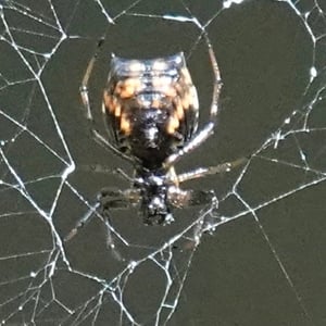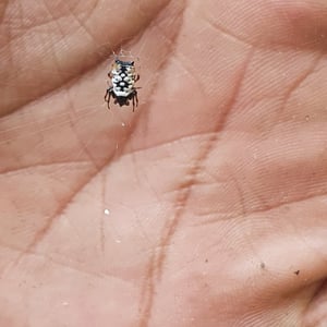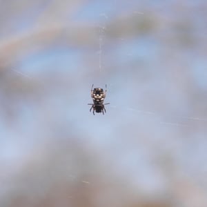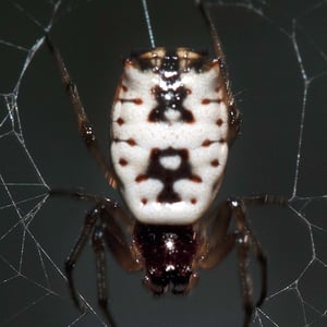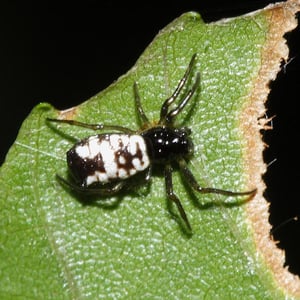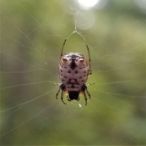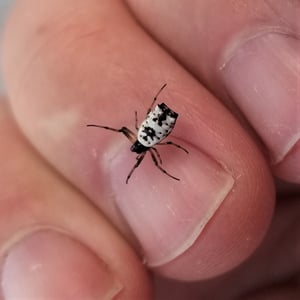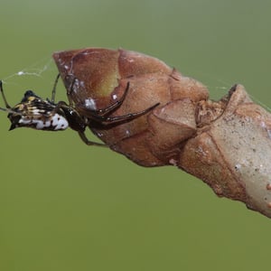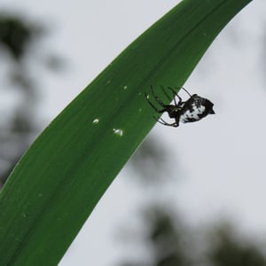 Micrathena mitrata, commonly known as the white micrathena or white-banded orb-weaver, is a species of spider belonging to the family Araneidae. It is characterized by its small size, with females measuring around 6-8 mm in length. The spider has a distinct white abdomen with black bands, and it constructs intricate orb-shaped webs to capture prey. Micrathena mitrata is commonly found in the southeastern United States and is known for its unique and visually striking appearance.
