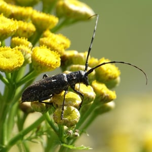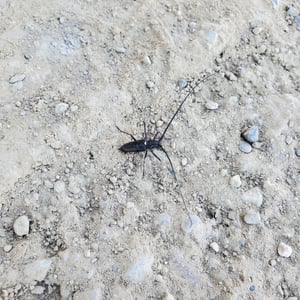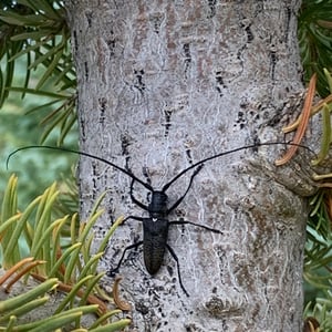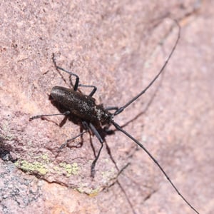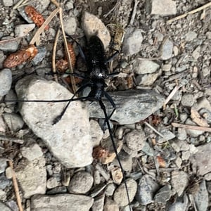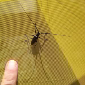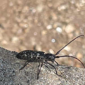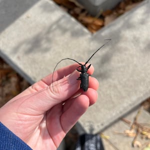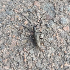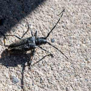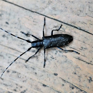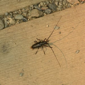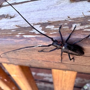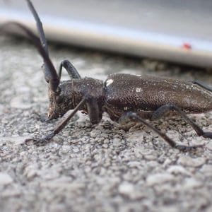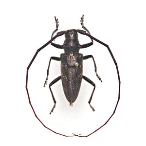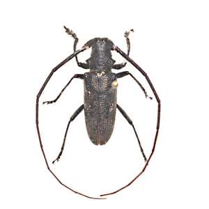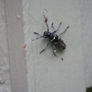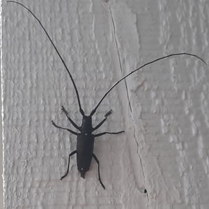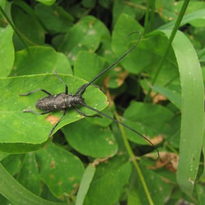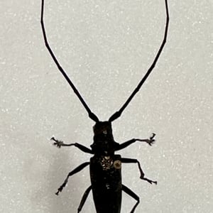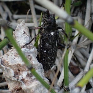 Monochamus scutellatus, commonly known as the white-spotted sawyer or spruce sawyer or spruce bug, is a common wood-boring beetle found throughout North America. It is a species native to North America.Adults are large-bodied and black, with very long antennae; in males, they can be up to twice the body length, but in females they are only slightly longer than body length. Both sexes have a white spot on the base of the wings, and may have white spots covering the wings. Both males and females also have a spine on the side of the prothorax. Most research done on M. scutellatus focuses on their relationship with burned forests and the logging industry, with interest also being shown in their mating behaviours.