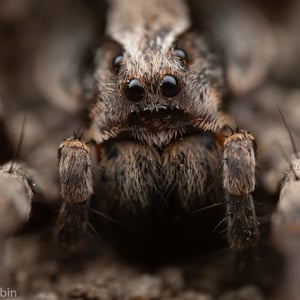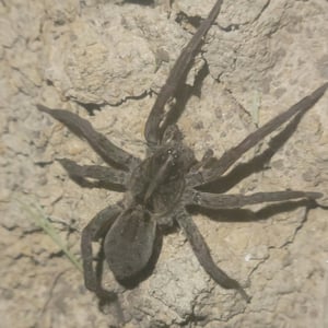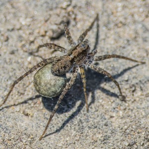 Wolf spiders are members of the family Lycosidae. They are robust and agile hunters with excellent eyesight. They live mostly in solitude, hunt alone, and do not spin webs. Some are opportunistic hunters, pouncing upon prey as they find it or chasing it over short distances; others wait for passing prey in or near the mouth of a burrow. Wolf spiders resemble nursery web spiders (family Pisauridae), but wolf spiders carry their egg sacs by attaching them to their spinnerets, while the Pisauridae carry their egg sacs with their chelicerae and pedipalps. Two of the wolf spider's eight eyes are large and prominent; this distinguishes them from nursery web spiders, whose eyes are all of roughly equal size. This can also help distinguish them from the similar-looking grass spiders.