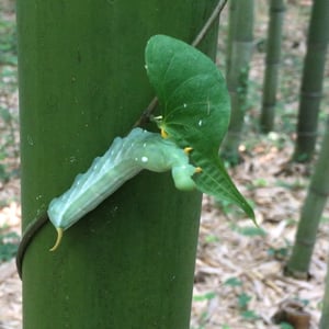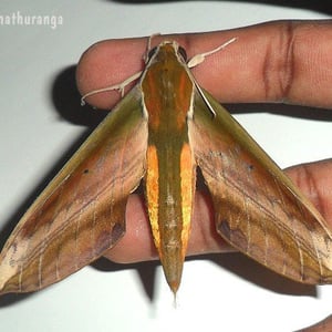 Larva is bluish green, with a subdorsal line with oblique streaks below it on 4th to 10th somites. Ocellus on the 4th somite is greenish with a black ring. The horn is yellowish. Larvae have been recorded on Amaranthus, Barringtonia, Dioscorea, Amorphophallus, Impatiens, Citrullus, Arathis, Boerhavia, Knoxia, Morinda, Oldenlandia, Pongamia, Spermacoce, Glossostigma and Camellia.