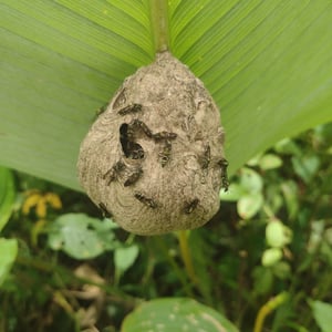 Nests are made up of several (two to eight) stacked combs, each covered with an envelope. They are made up of wood pulp and water. The envelope of one comb provides the support on which to build the next comb. The shape of the nest is called phragmocyttarous, which means that combs are attached to the inside surface of the nest laterally. Usually, the number of cones is appropriate for the number of wasps in the nest. Nests are about 10–25 cm long. They are built in neotropic areas in shrubs and trees in pastures, hedgerows, forest edges, and on and around buildings. The nests are usually built in the morning. They are built by the workers through a division of labor; they are social wasps. The nests are built top to bottom to form a shape of a teardrop.
