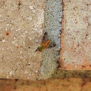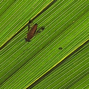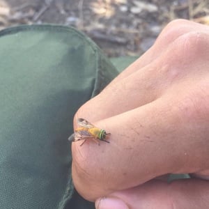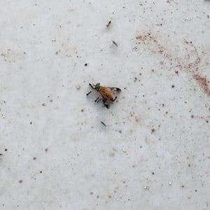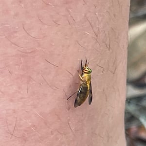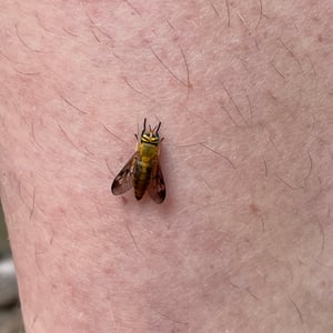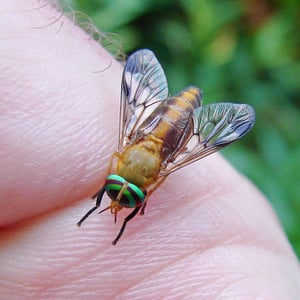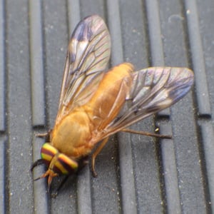 Adult yellow flies are around 1 cm long with yellow bodies, mid-legs, and hind-legs, and black fore-legs. The eyes are blue-green with purple bands. They fly with little sound, and the first sign of their presence noticed by humans is usually their bite. The larvae are thin white grubs with fine yellow fur, each segment having three pairs of pseudopodia.