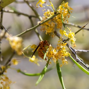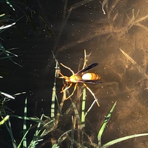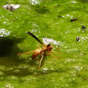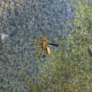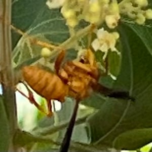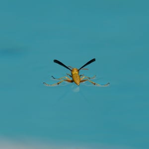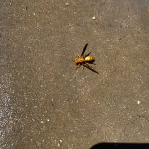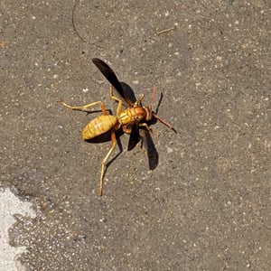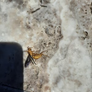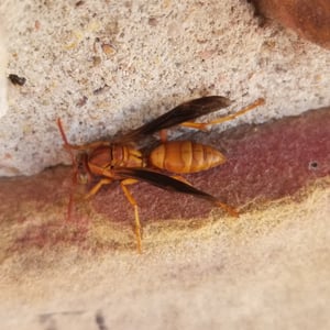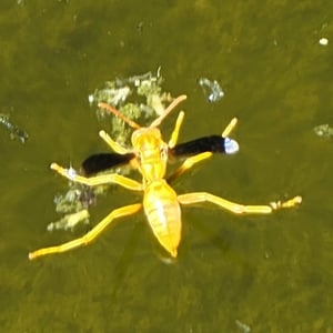 Polistes flavus, commonly known as the yellow paper wasp, is a species of social wasp found in North America. It is characterized by its vibrant yellow coloration and slender body shape. These wasps build small, open-celled paper nests in protected areas such as eaves, tree branches, or shrubs. They are known for their aggressive behavior when their nests are disturbed, but they play an important role in controlling pest populations by preying on insects.