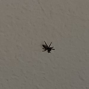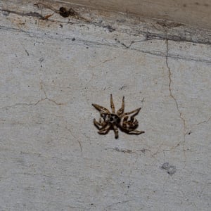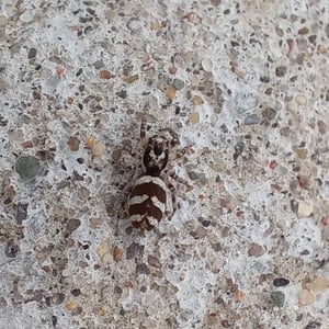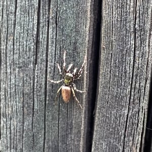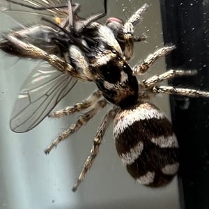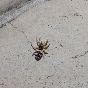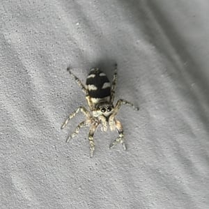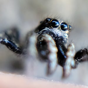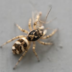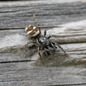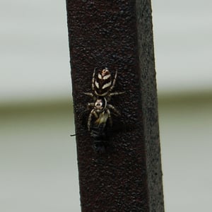Coloration is determined by various scales (modified setae) covering a brown or black integument. Narrow scales (or hairs) may be black or red/rust colored, while broad scales are either iridescent (often magenta or green) or opaque granular white or yellow. Several common species have a dorsal pattern of black narrow scales and white granular scales arranged in transverse stripes, especially on the abdomen, from which the common name “zebra spiders” originates, e.g. Holarctic Salticus scenicus (Clerck, 1757). Some Salticus species in the Southwestern US and Mexico have red and white transverse stripes on the abdomen, e.g. Salticus palpalis (Banks, 1904). Some lack the “zebra” stripes completely and have both dorsal abdomen and cephalothorax covered with iridescent scales, e.g. Salticus peckhamae (Cockerell, 1897). Since the dorsal coloration does not seem to be involved in the male’s courtship display the coloration may have been selected for camouflage or mimicry. For example, there is a strong similarity between S. palpalis and Agapostemon sweat bees. Salticus species range in length from 3-7 mm. Males are smaller than females, but have elongated chelicerae and pedipalps.