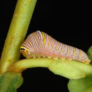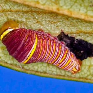 The zebra swallowtail caterpillar feeds on species within the genus Asimina and was found to accept, oviposit and grow on leaves of the tropical soursop- Annona muricata in 1998. Commonly used species include Asimina angustifolia (slimleaf pawpaw), A. incana (woolly pawpaw), A. parviflora (smallflower pawpaw), A. reticulata (netted pawpaw), A. tetramera (four-petal pawpaw), and A. triloba (common pawpaw). P. marcellus caterpillars ingest chemicals called annonaceous acetogenins from their host plants, which are retained in the body tissues of both the caterpillar and the adult, and may help chemically protect the butterfly from birds.