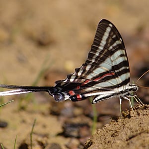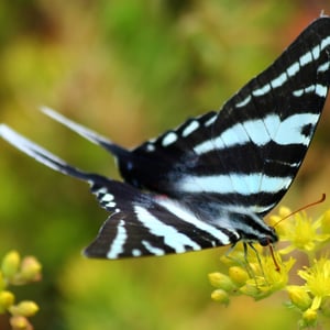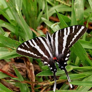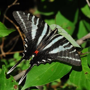 Protographium marcellus, the zebra swallowtail, (formerly listed under genera Eurytides, Iphiclides, Graphium and Papilio by some authorities) is a swallowtail butterfly native to the eastern United States and southeast Canada. It is the state butterfly of Tennessee. Its distinctive wing shape and long tails make it easy to identify, and its black-and-white-striped pattern is reminiscent of a zebra. The butterflies are closely associated with pawpaws, and are rarely found far from these trees. The green or black caterpillars feed on the leaves of various pawpaw species, while the adults feed on flower nectar and minerals from damp soil.
