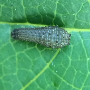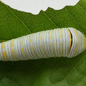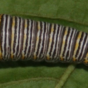 Since the caterpillars are cannibalistic, females lay their eggs singly on pawpaw leaves or on the tree trunks. The round egg is pale green, later turning orange brown. Young caterpillars are black with lighter colored transverse stripes. Older larvae have two color forms. The more common form is green with yellow and white transverse stripes; the rarer form is black and banded with white and orange. In both forms, between the swollen thorax and the abdomen, there is a yellow, black, and bluish-white band. The larva has a yellow, foul-smelling, forked gland called an osmeterium which it will use to deter predators, especially spiders and ants. The chrysalis is either green or brown, and is more compact compared to chrysalids in the genus Papilio. Three small horns project from the head and thorax. The chrysalis hibernates in areas of its range with cold winters.